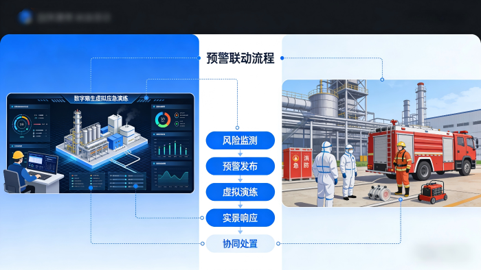 孪生工厂EPC项目运营阶段常面临设备故障、自然灾害、安全事故等突发风险,传统应急模式依赖人工巡检与预设预案,存在响应滞后、演练成本高、预案与现场脱节等痛点,易引发生产中断与巨额经济损失。捷瑞数字以“虚实协同+全流程预判”为核心,构建覆盖预警、演练、处置、复盘的全链条应急管理体系,依托数字孪生技术打通各环节信息壁垒,实现应急能力迭代升级,最大限度降低突发风险影响。